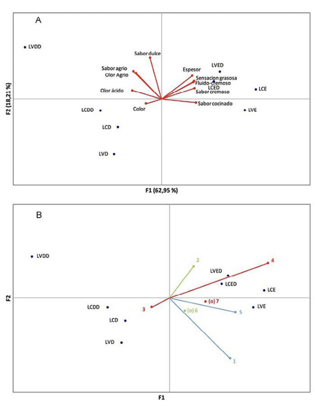 LVE: leche de vaca entera. LCE: leche de cabra entera. LVED: leche de vaca entera-deslactosada. LCED: leche de cabra entera-deslactosada. LVD: leche de vaca descremada. LCD: leche de cabra descremada. LVDD: leche de vaca descremada-deslactosada. LCDD: leche de cabra descremada-deslactosada.