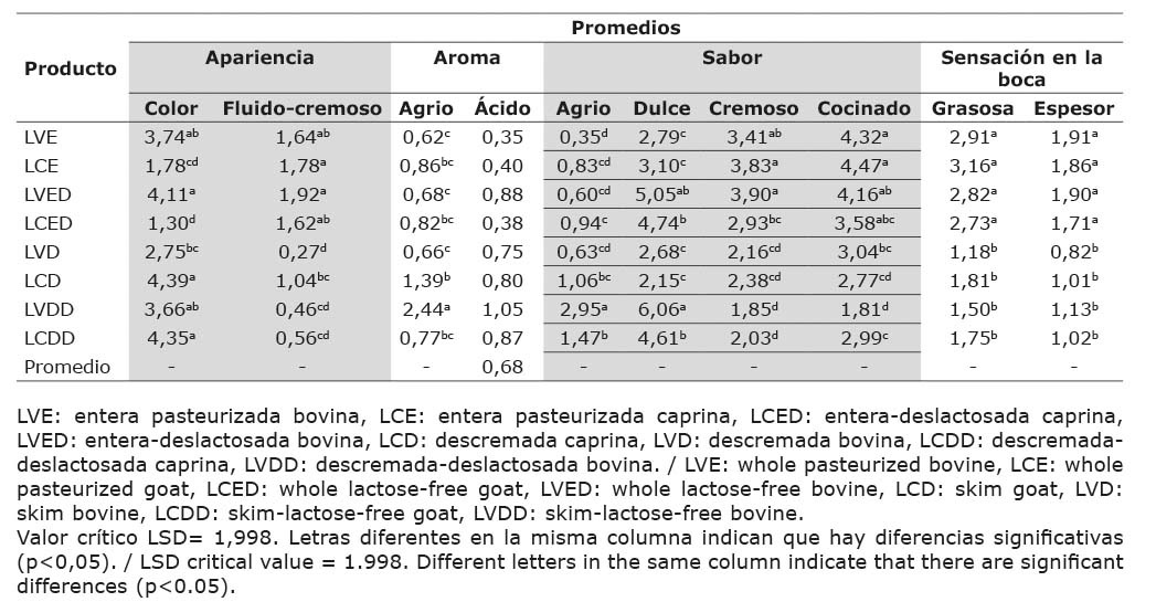Las leches enteras y enteras-deslactosadas de las dos especies mostraron mayor apariencia fluido-cremosa, destacándose más en este aspecto la leche de vaca entera-deslactosada y la leche entera de cabra. Las leches descremadas y descremadas-deslactosadas, sin importar el tipo de leche, obtuvieron valores menores (Cuadro 5).