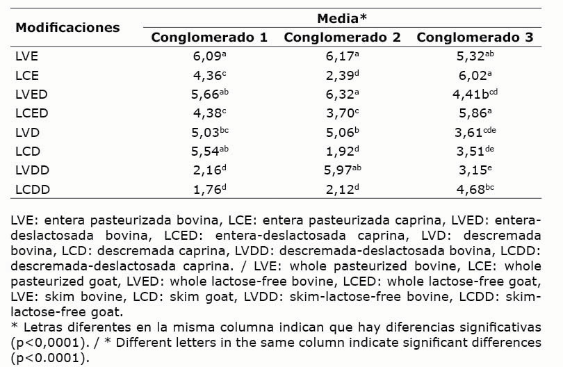 Para cada uno de los tres diferentes conglomerados establecidos se determinó que hubo diferencias significativas en el agrado entre las leches modificadas (p<0,0001, gljueces=38, glproductos=7) (Cuadro 6).