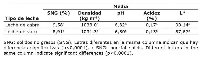La leche de cabra procesada mostró valores de SNG, densidad, acidez y L* superiores y menor pH que los de leche de vaca sometida al mismo tratamiento (p<0,05) (Cuadro 2).