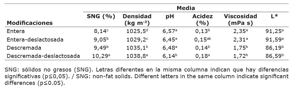 Al comparar la composición de las leches descremadas y deslactosadas de ambas especies con las leches enteras (Cuadro 1), se observó un efecto de los procesos de pasteurización en conjunto con las modificaciones. Los valores de acidez, densidad y SNG de ambos tipos de leche aumentaron con los procesos, mientras que el pH disminuyó.