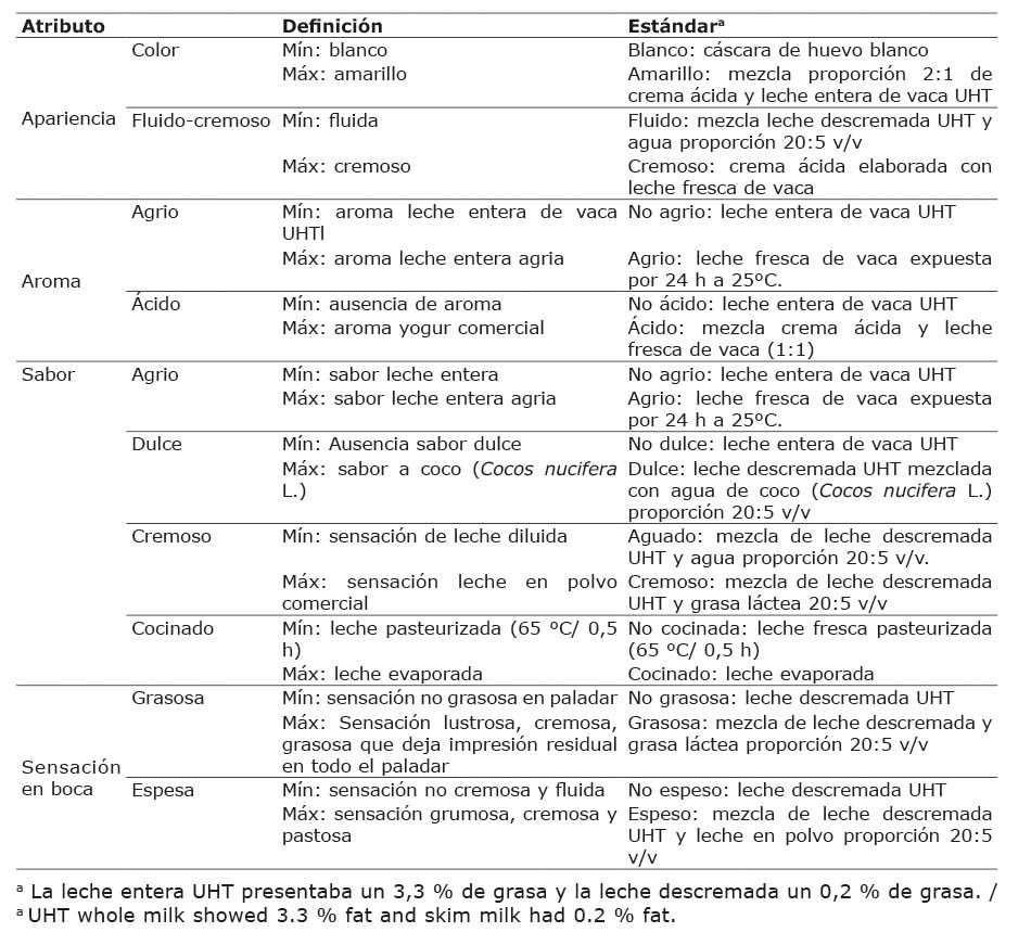 En el análisis descriptivo genérico de las muestras de leche procesadas (QDA) los jueces generaron un total de diez descriptores, donde cuatro fueron para el sabor y dos para cada una de las categorías de apariencia, aroma y sensación en boca. Las definiciones generadas se muestran en el Cuadro 4, según atributo, además de los estándares utilizados como anclas inferior y superior de los descriptores, con el fin de homogenizar el criterio de evaluación.