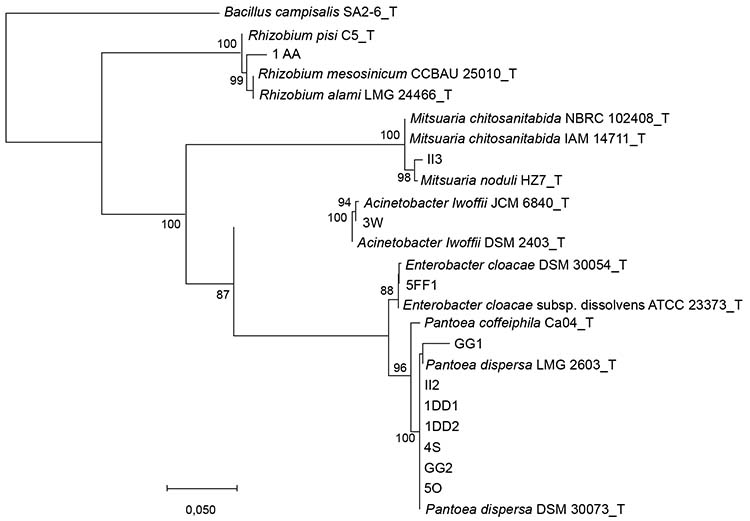 The strains II3, 3W and 5FF1 were closely related to the type strains Mitsuaria noduli HZ7T, Acinetobacter lwoffii JCM 6840T and Enterobacter cloacae ATCC 23373T, respectively (Figure 1, Table 3). The other seven strains were related with Pantoea genus and were closely related to the reference strain Pantoea dispersa DSM 30073T (Figure 1) with a high percentage of identity (Table 3).