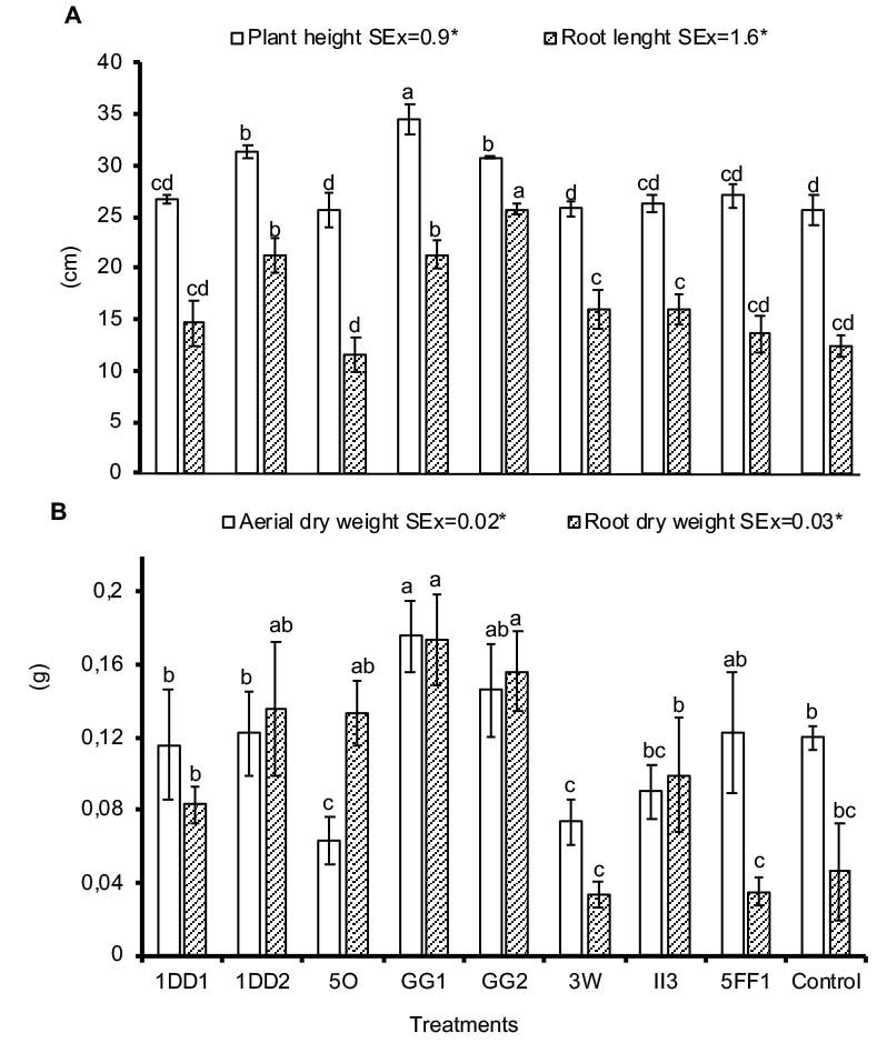 The evaluation of the inoculation effect on plants biomass, showed that the treatment inoculated with strain GG1 favored the growth of aerial dry weight. Additionally, the plants inoculated with strains GG1 and GG2 increased significatively the root dry weight (Figure 2B).