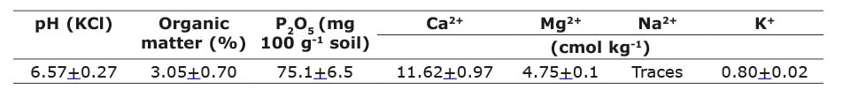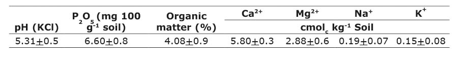 The soil substrate presents the following characteristics: high clay content, poor drainage, acid pH, high organic matter content, and low phosphorus, calcium, magnesium, sodium and potassium contents (Hernández-Jiménez et al., 2015) (Table 2). The dates were obtained in Plant Nutrition and Biofertilization Laboratory of the Instituto Nacional de Ciencias Agricolas, Mayabeque, Cuba.