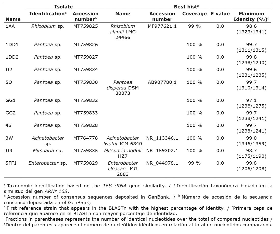 A group of bacteria with similar cultural characteristics to Rhizobium genus was isolated from rice plant cultivar INCA LP-7 rhizosphere. However, before the 16SrRNA sequencing was determinate that they belonged to three classes: Alfaproteobacteria (Rhizobium), Betaproteobacteria (Mitsuaria), and Gammaproteobacteria (Acinetobacter, Enterobacter and Pantoea). The phenotypic studies can be complemented with molecular tools such as 16S rRNA sequencing (polyphasic taxonomy) for bacterial identification. This is the first report that studies part of the bacterial community associated to Cuban rice cultivar INCA LP-7.