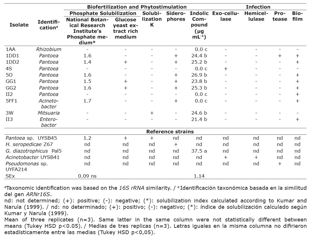 The characterization of the eleven rizospheric strains allowed distinguishing some potentialities as PGPB. The results showed that 54.5 % and 27.3 % of them solubilized calcium phosphate in NBRIP and GL media, respectively; since translucent halos around the growth were showed (Table 4).