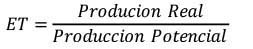 Entre más pequeña sea la diferencia entre la producción real y potencial, la eficiencia es mayor. Al ser igual la producción real con la potencial no hay brechas tecnológicas y el valor de la ecuación será de uno y la producción presenta la máxima eficiencia. Se obtuvo de elevar el promedio del valor de los insumos por el valor de los parámetros de cada uno (semillas, mano de obra, fertilizantes y área) estimados en el modelo y reemplazados en la función de producción.