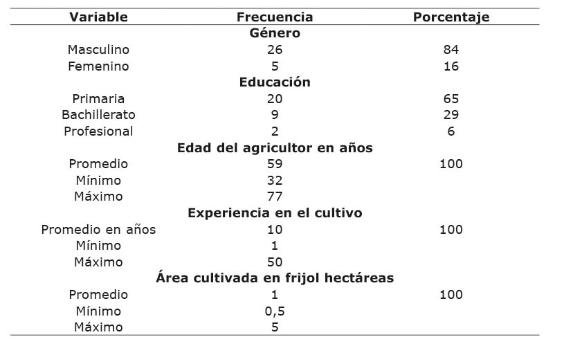 El cultivo del frijol caupí forma parte de la dieta de los habitantes de la Región Caribe y la producción en la mayoría fue bajo el modelo de agricultura familiar, con una baja proporción de insumos contratados. Algunas características sociales se pueden apreciar en el Cuadro 1.