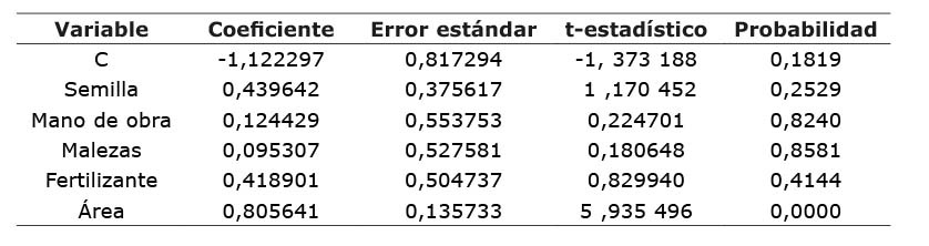 Los resultados de la regresión por el método de mínimos cuadrados y la estimación de parámetros se pueden apreciar en el Cuadro 2. El valor de los parámetros indica la elasticidad del producto con relación a los insumos en este caso la semilla, la mano de obra las malezas el fertilizante y el área cultivada.