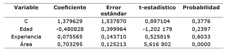 En el caso de la variable edad, con un valor del parámetro de -0,480828 con signo negativo, indica que entre más edad tienen los agricultores, conocen más el manejo del cultivo y podrían ser eficientes en el momento de asignar recursos.