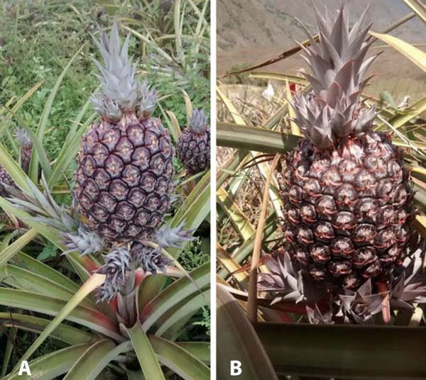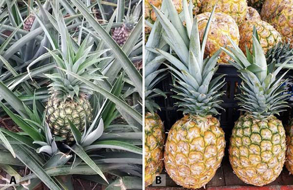Figure 3. Plant and fruit of pineapple Manzana variety. A. Plant. B. Fruit. Photos: Carol Puentes Díaz.