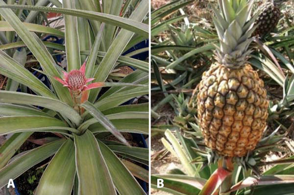 Figure 2. Pineapple plant and fruit of pineapple Perolera variety. A. Inflorescence. Photo: Yacenia Morillo. B. Fruit. Photo: Lizcano Jiménez (2010).