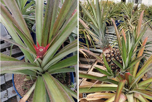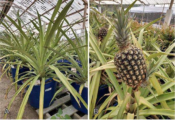Figure 1. Plant and fruit of pineapple MD-2 variety. A. Plant. Photo: Carol Puentes. B. Fruit. Photo: Yacenia Morillo.