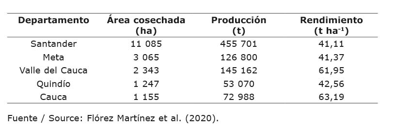El cultivo de piña es generador de empleo tanto en las zonas de producción como en las zonas de comercialización, debido a que por cada hectárea de piña se provee un empleo directo y dos indirectos (Granado Pérez & Aguillón Mayorga, 2019). En Colombia, la piña se encuentra entre las líneas productivas con mayor participación en el área sembrada hortofrutícola (Adame-Ovalle & Arbeláez-González, 2019). Este renglón productivo se ha incrementado en los últimos años y aumentó su participación en la economía nacional, ya que para el año 2019 se tenían 38 317 ha sembradas de piña, con una producción de 1 008 687 t y un rendimiento promedio de 43,15 t ha-1 (Granado Pérez & Aguillón-Mayorga, 2019).