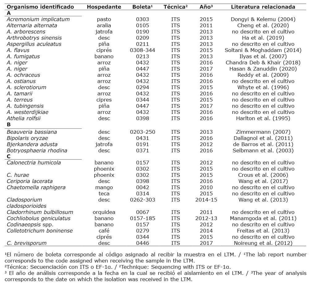 Table 1. Microorganisms identified in alphabetical order (letters A, B, and C) at the Laboratory of Molecular Techniques applied to Plant Protection, Universidad de Costa Rica, during the years 2009-2018. Montes de Oca, San Jose, Costa Rica.
