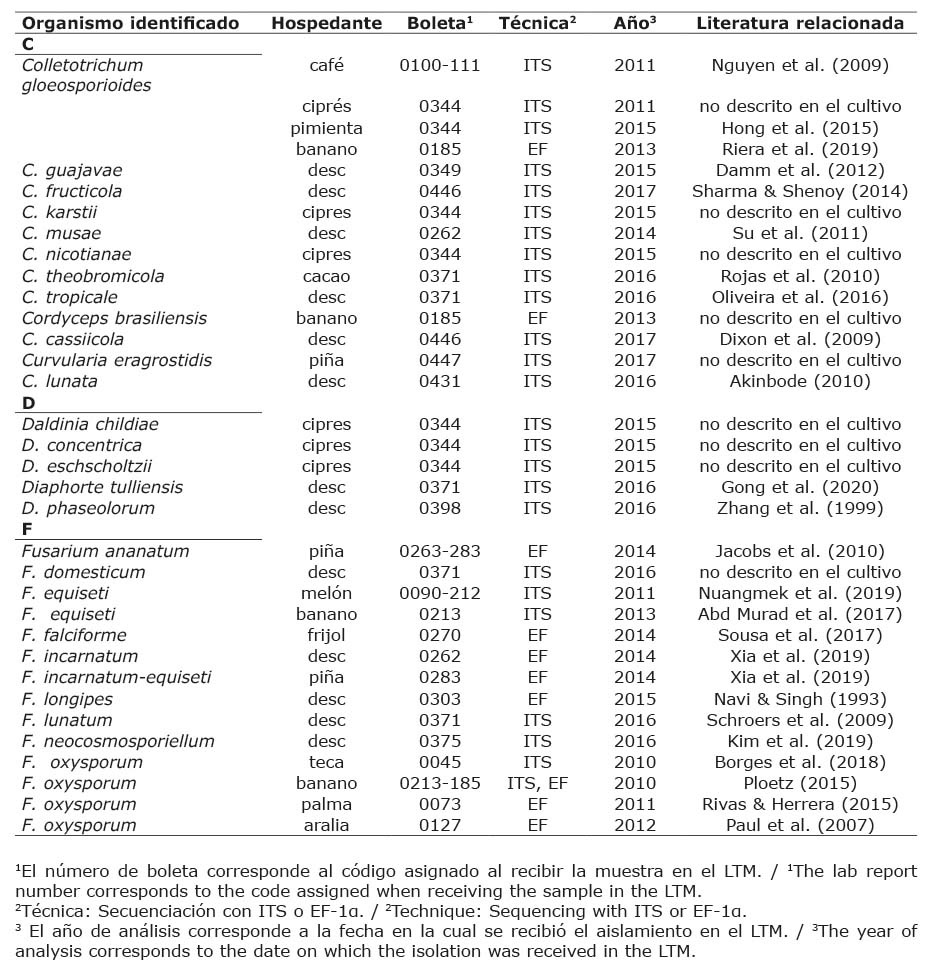 Table 2. Microorganisms identified in alphabetical order (letters C, D, and F) at the Laboratory of Molecular Techniques applied to Plant Protection, Universidad de Costa Rica, during the years 2009-2018. Montes de Oca, San Jose, Costa Rica.