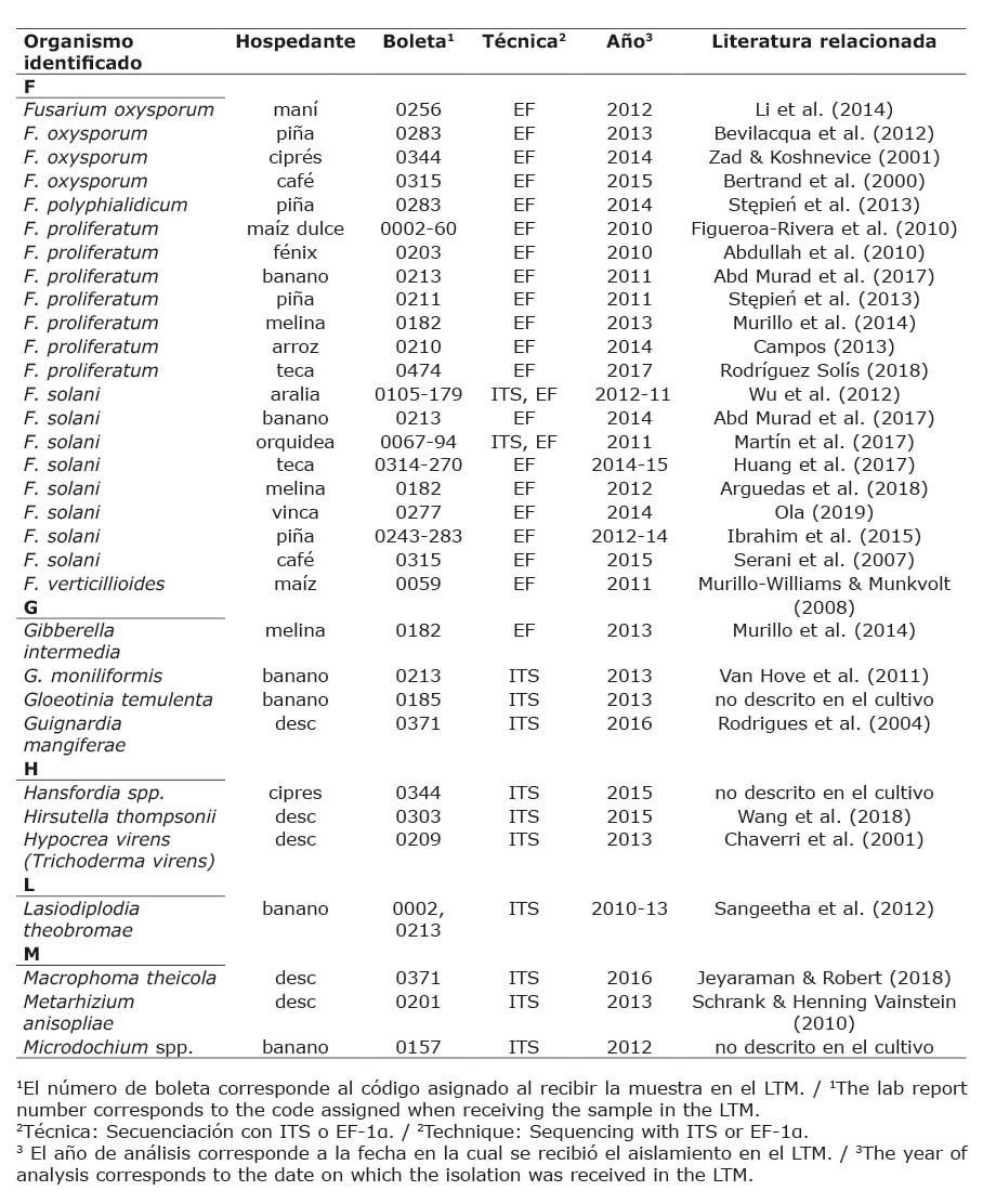 Table 3. Microorganisms identified in alphabetical order (letter F, G, H, L, and M) at the Laboratory of Molecular Techniques applied to Plant Protection, Universidad de Costa Rica, during the years 2009-2018. Montes de Oca, San Jose, Costa Rica.