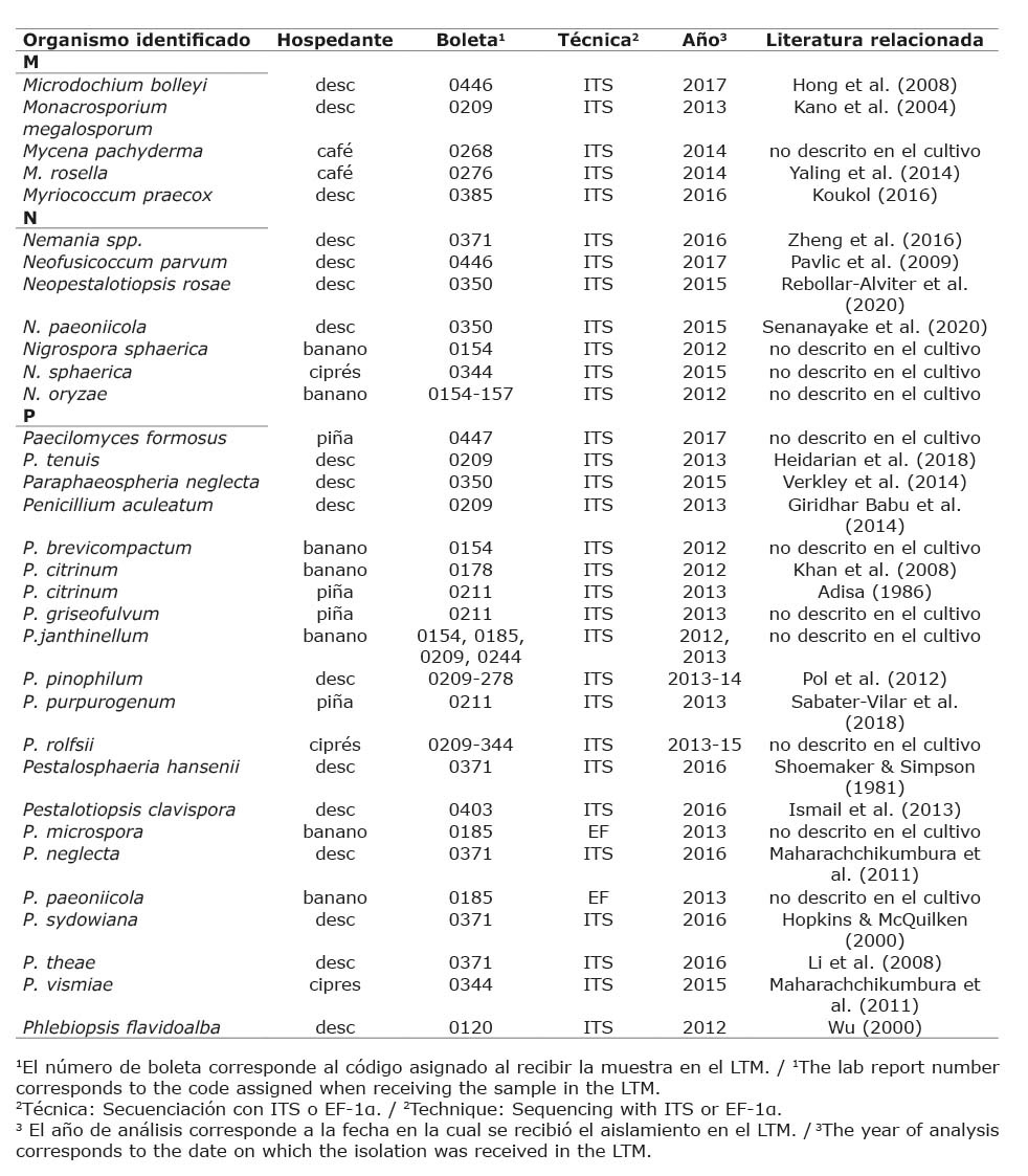Table 4. Microorganisms identified in alphabetical order (letters M, N, and P) at the Laboratory of Molecular Techniques applied to Plant Protection, Universidad de Costa Rica, during the years 2009-2018. Montes de Oca, San Jose, Costa Rica.