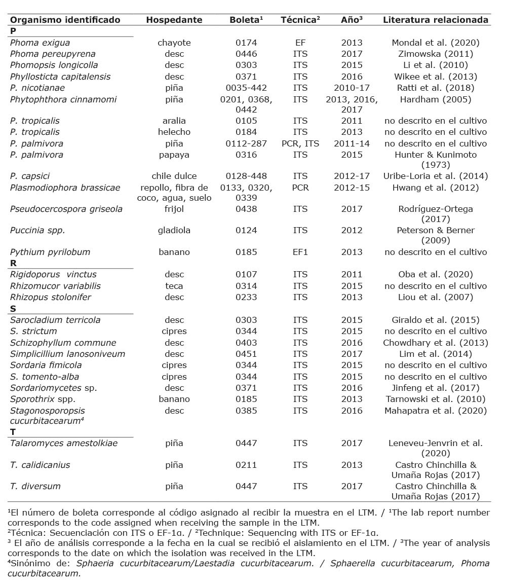 Table 5. Microorganisms identified in alphabetical order (letters P, R, S, and T) at the Laboratory of Molecular Techniques applied to Plant Protection, Universidad de Costa Rica, during the years 2009-2018. Montes de Oca, San Jose, Costa Rica.