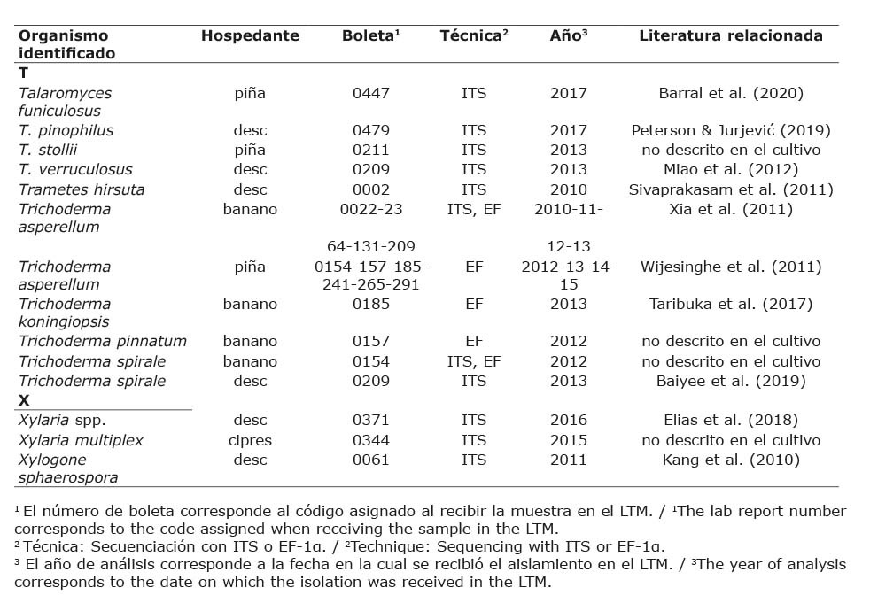 Table 6. Microorganisms identified in alphabetical order (letters T and X) at the Laboratory of Molecular Techniques applied to Plant Protection, during the years 2009-2018. Montes de Oca, San Jose, Costa Rica.