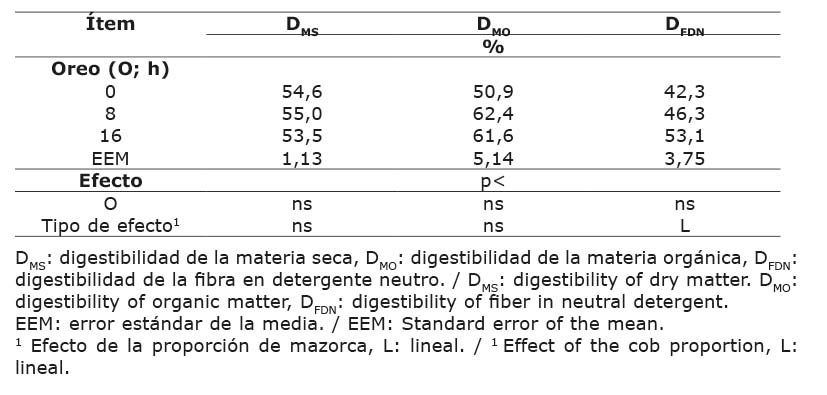 El tiempo de oreo no afectó la digestibilidad de los macrocomponentes del ensilaje de maíz del cultivar Simijaca (Cuadro 9), sin embargo, se observó una tendencia a aumentar la digestibilidad de la FDN con el tiempo de oreo (p<0,1).