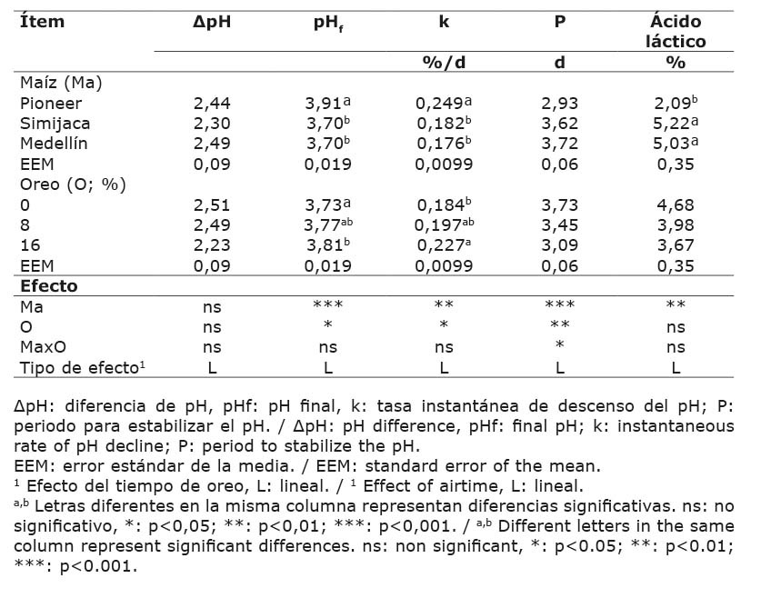 La dinámica del pH en el ensilaje de maíz Pioneer fue diferente a la observada para los otros dos cultivares (Cuadro 10); ya que el primero registró un mayor valor de pH final y tasa de descenso (p<0,05) y menor porcentaje de ácido láctico (p<0,05). Además, el tiempo de oreo afectó de forma lineal el valor de pH final y la tasa de descenso del pH, fue mayor en el ensilaje sometido a mayor tiempo de oreo, comparado con el material que no fue oreado (p<0,05). El cultivar y el tiempo de oreo modificaron el tiempo de estabilización del pH del silo. El maíz híbrido Pioneer no presentó diferencias entre los tiempos de oreo (p>0,05), el cultivar Simijaca solo entre las 0 y 16 horas (3,84 vs 3,40 d, respectivamente), mientras que el cultivar Medellín presentó diferencias en todos los tiempos de oreo (4,29, 3,75 y 3,11 d, para 0, 8 y 16 horas, respectivamente; Cuadro 10).