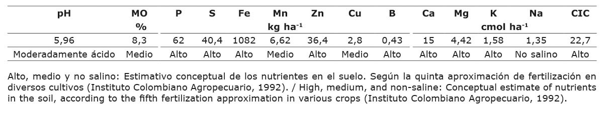 El plan de fertilización se estableció en función de la composición química del suelo (Cuadro 1) y se llevó a cabo en dos momentos del cultivo, de acuerdo con la siguiente descripción: i. Al momento de la siembra: 1000 kg ha-1 de cal dolomita, 20 kg ha-1 de urea, 150 kg ha-1 de fosfato diamónico (DAP), 25 kg ha-1 de sulfato de magnesio y 10 kg ha-1 de boro. ii. Al aporque de las plantas: 20 kg ha-1 de urea, 25 kg ha-1 de sulfato de magnesio y 10 kg ha-1 de boro.