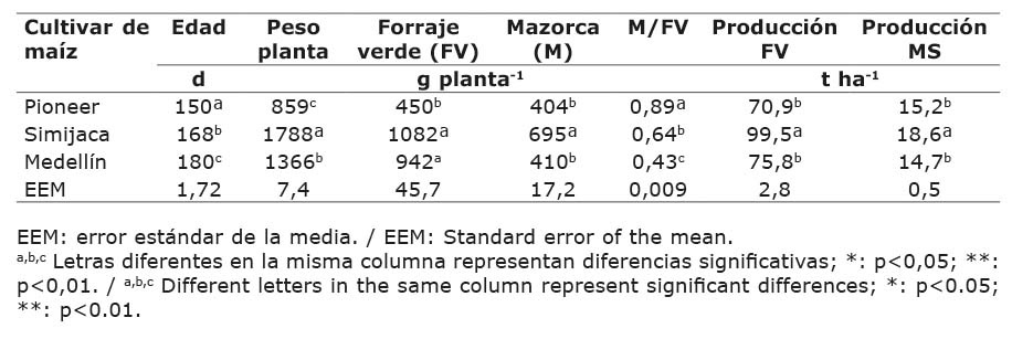 El híbrido de maíz Pioneer presentó mayor (p<0,05) precocidad y menor (p<0,05) peso de las plantas y producción de forraje verde por planta que los cultivares Simijaca y Medellín. Además, el híbrido Pioneer tuvo una mayor (p<0,05) relación mazorca:forraje verde respecto a los demás cultivares evaluados (Cuadro 2). El peso de las plantas y de las mazorcas, así como la producción de biomasa verde y seca, fue mayor (p<0,05) en el cultivar Simijaca. En este sentido, el cultivar Simijaca presentó 22,3 y 26,5 % mayor (p<0,05) producción de MS por unidad de área respecto a la producción observada para Pioneer y Medellín en un ciclo productivo, respectivamente (Cuadro 2).