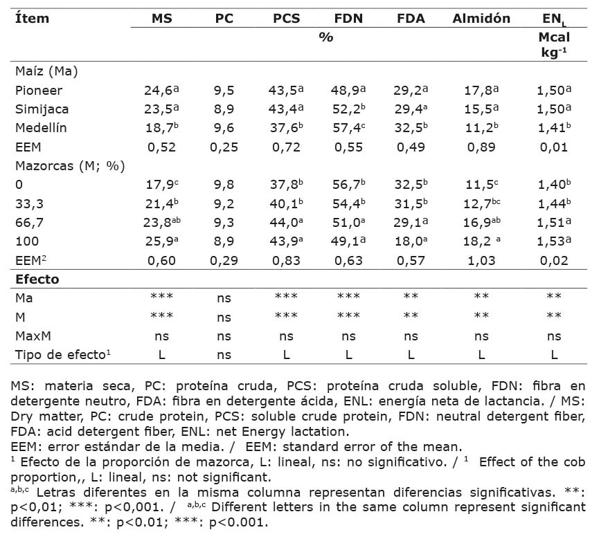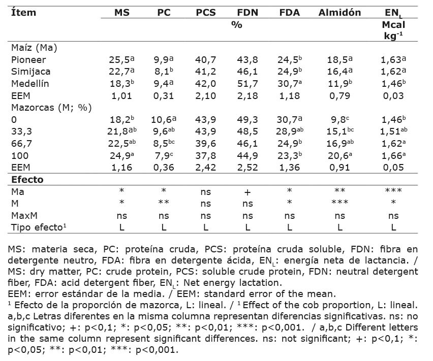 No se observaron efectos asociados a la interacción entre el cultivar de maíz y la proporción de mazorcas (Cuadro 5). El ensilaje de maíz del cultivar Medellín presentó la menor concentración de MS, PCS, almidón y ENL (p<0,05) y el mayor porcentaje de FDN, comparado con los otros maíces. Con el aumento en la proporción de mazorcas se observó un incremento lineal en el contenido de MS, PCS, almidón y ENL en el ensilaje y una reducción lineal en la concentración de FDN y FDA. La composición química del forraje fresco y ensilado presentó una correlación positiva (R: 0,69; 0,52; 0,55 y 0,77 para MS, PC, FDN y almidón, respectivamente, p<0,05), excepto en la concentración de PCS, la cual se redujo en el material fresco al aumentar la proporción de mazorca, pero aumentó en el material ensilado (Cuadro 3 y 5).
