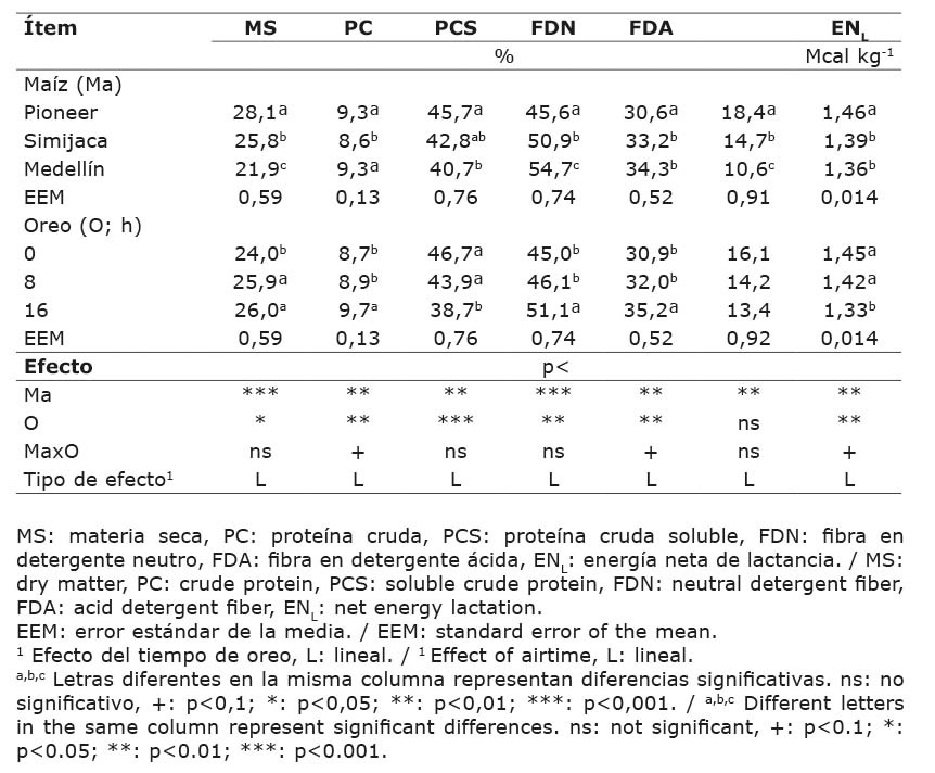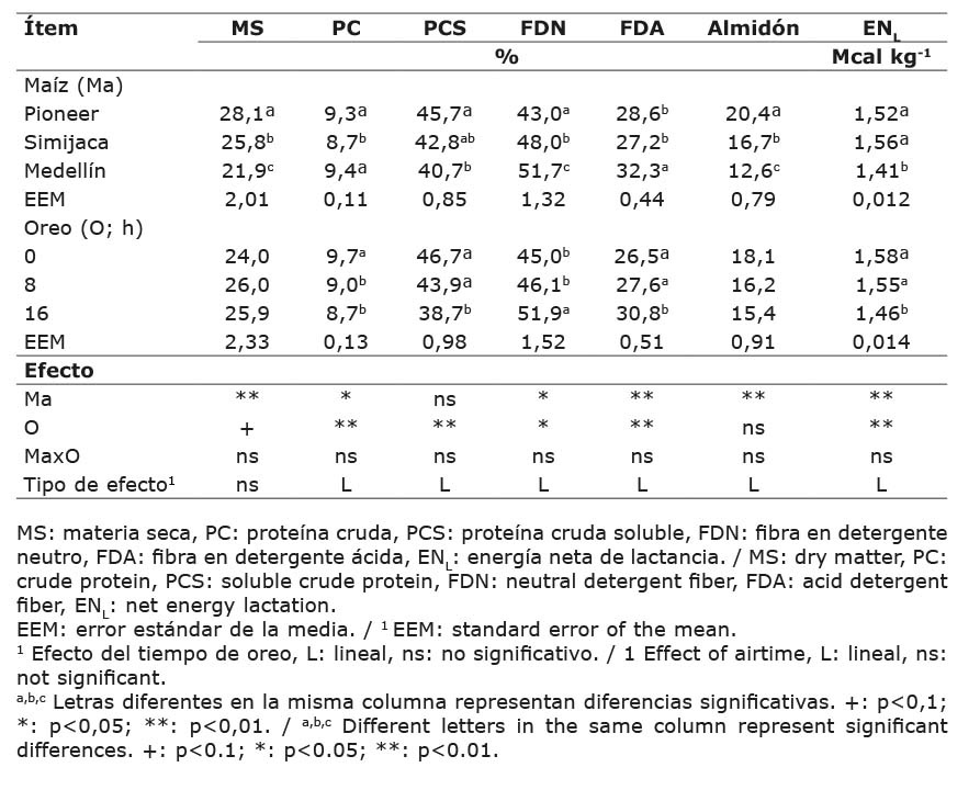 El oreo previo al sellado causó un efecto positivo sobre la MS, pero negativo sobre la concentración de almidón y ENL del material vegetal previo al empaque y fue más notorio en el maíz Pioneer.
