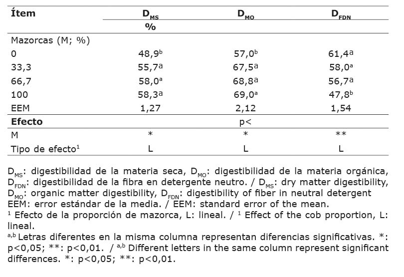La digestibilidad de la materia seca y la materia orgánica del ensilaje de maíz del cultivar Simijaca tuvo un incremento lineal con el aumento en la proporción de mazorcas y fue menor en la biomasa sin mazorcas, comparado con las otras tres proporciones (p<0,05) (Cuadro 6). El ensilaje de maíz con 100 % de mazorcas registró una menor digestibilidad de la FDN, comparado con las otras proporciones evaluadas.