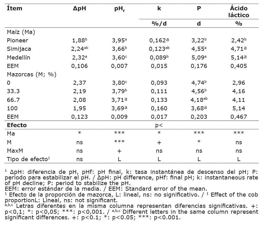 El maíz híbrido Pioneer presentó mayor pH final y tasa de descenso (p<0,05), pero menor delta de pH (p<0,05) y demoró 1,87 días menos para estabilizar la fermentación respecto al cultivar Medellín (Cuadro 7). Además, la concentración de ácido láctico fue dos veces mayor en el ensilaje de maíz de los cultivares Simijaca y Medellín, comparado con el híbrido Pioneer (p<0,05). El aumento en la proporción de mazorcas generó una mayor dinámica fermentativa, aumentó la tasa de descenso del pH y la concentración de ácido láctico (p<0,05), y redujo el pH final y el tiempo requerido para la estabilización del pH (p<0,05).