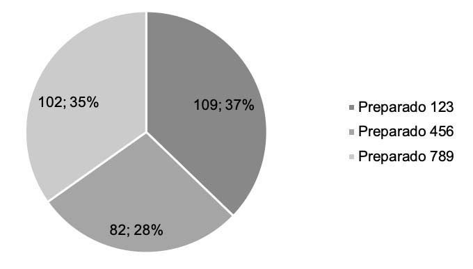La valoración del atributo sabor por parte del jurado mostró que la opción con más frecuencia de respuesta fue “no me gusta, ni me disgusta” (moda = 2) para el preparado 123, mientras que los preparados 789 y 456, la elección más significativa fue “me gusta” (moda = 3). El preparado más representativo de las muestras fue el que presentó 7 % de quinua cocida, con un total de 109 puntos (Figura 1).
