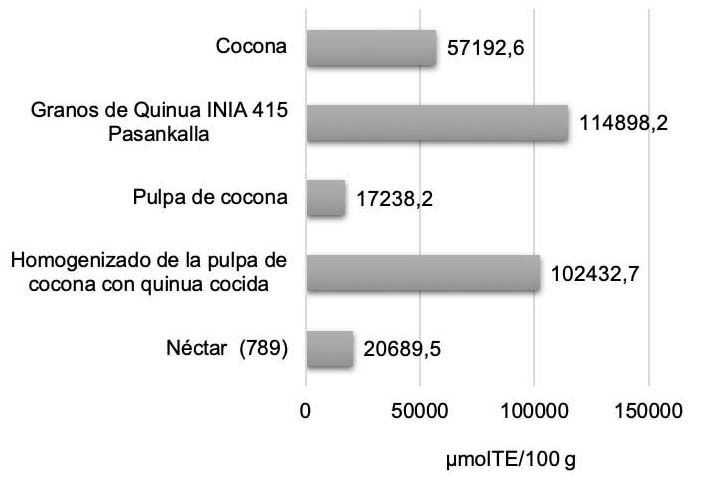 Se han determinado valores para la semilla de siete variedades de quinua en Chile, muy por debajo de lo observado en este estudio, entre 10,74 y 20,17 mmol de equivalentes de Trolox (TE)/100 g, con el método DPPH (22,-diphenyl-2-picryl-hydrazyl), mientras que con el método ORAC (oxygen radical absorbance capacity) se observaron valores entre 22,25 y 73,16 mmol TE 100/g, diferencias debidas no solo a los cultivares, sino también a los métodos de detección, pues estos varían en los mecanismos de acción (Vega-Gálvez et al., 2018), en ese sentido se observó un reporte para la quinua cocida de la variedad Pansakalla de 2000 µmol TE/100 g con el método DPPH (Vidaurre-Ruiz et al., 2017).