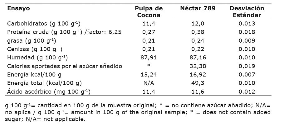 La composición proximal del néctar con mayor aceptación sensorial (789), presentó considerable contenido de nutrientes (Cuadro 1), de entre el 1,7 % y 42 % con respecto al néctar de cocona. En este estudio, se obtuvo una bebida bioactiva comparable en actividad antioxidante según ABTS, a la propuesta de una bebida de maíz de Bonilla et al. (2015), valorada también en una escala hedónica.