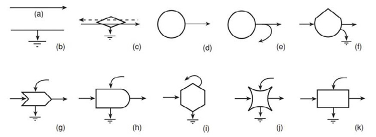 References: (a) energy flow, (b) heat sink, (c) transaction, (d) force-controlled source, (e) flow-controlled source/renewable source, (f) storage, (g) interaction, (h) producer, (i) consumer, (j) switching action, (k) box.