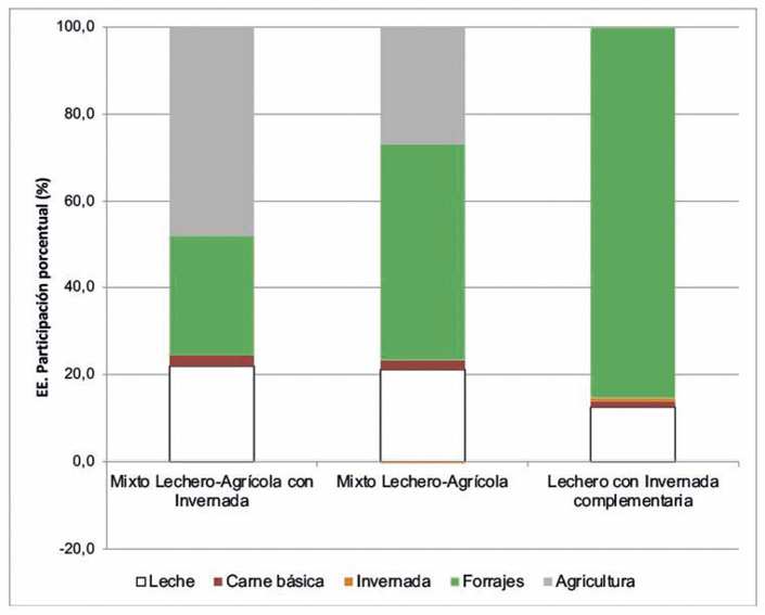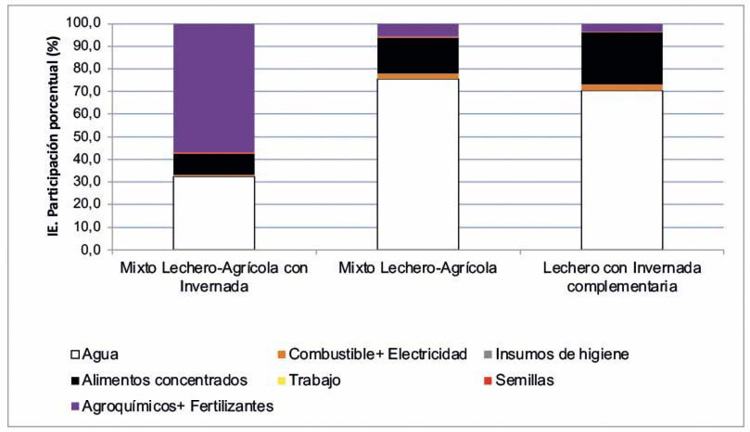 Se observó que en términos promedio, los sistemas ganaderos puros lograron una mayor eficiencia, a raíz de sus elevadas producciones y un menor consumo de energía. Por el contrario, los sistemas con mayor diversificación resultaron menos eficientes, debido en gran medida a la cantidad de energía ingresada (IE) al sistema para su funcionamiento. Se observó que el sistema mixto lechero-agrícola con invernada tuvo un desbalance en las entradas de agroquímicos y fertilizantes con relación a los otros modelos, en los cuales las principales fuentes son el recurso hídrico y los alimentos concentrados (Figura 5). La energía insumida durante el proceso de producción y vinculada a la mano de obra, resultó despreciable.