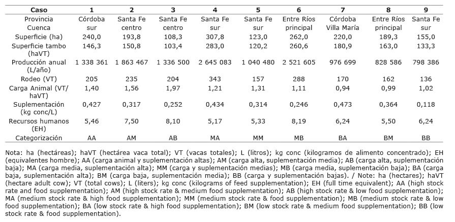 Información proporcionada por la encuesta sectorial lechera del Programa Nacional de Producción Animal (PNPA 1126043) (Gastaldi et al., 2016), muestra una heterogeneidad en los modelos de producción lecheros, en sus condiciones de intensificación, propuesta en términos de carga animal y nivel de suplementación alimentaria. Con este criterio, se trabajó con datos retrospectivos de nueve establecimientos reales de producción primaria de leche a escala comercial en la mencionada región, durante el período comprendido entre julio de 2014 a junio de 2015. Estos difirieron en sus niveles de carga animal y suplementación (alta, media y baja para cada parámetro, determinándose nueve combinaciones posibles). Las características principales de los establecimientos se observan en Cuadro 1.