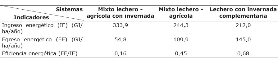 Table 2. Energy indicators (input, output, and efficiency) for three most frequent models dairy farms located in Cordoba, Santa Fe, and Entre Rios, provinces of Argentina, during the evaluation and energy analysis period, 2014-2015.
