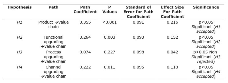 The process upgrading did not affect value chain (Y) with a track coefficient value of 0.074 (p-value =0.227) (Table 1).