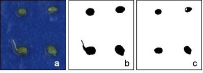 Para segmentar fotografías de pruebas con semillas germinadas se ajustaron los valores de los umbrales YUV. Primero se eliminó el fondo azul de la imagen y los valores utilizados fueron Y 0 – 255 U 0 – 161 V 0 – 255. Luego se repitió el procedimiento, pero se eliminó el fondo azul (Figura 1B) y las radículas de las semillas (Figura 1C); los valores de los umbrales YUV en este caso fueron Y 0 – 218 U 0 – 96 V 0 – 255.