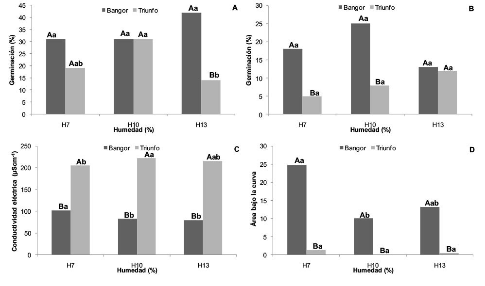 Cuando se comparó el área bajo la curva entre cada variedad para cada una de las humedades, se determinaron valores superiores para Bangor de 25, 10 y 13, para las humedades de 7 %, 10 % y 13 %, respectivamente (Figura 2D). Por otra parte, al comparar el efecto de la humedad de las semillas en cada variedad, se determinó que para Bangor la semilla al 7 % superó en quince unidades a las que tenían porcentaje de humedad del 10 %, mientras que en Triunfo no se presentaron diferencias.
