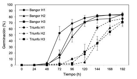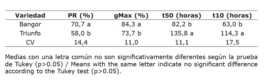 Bangor presentó valores superiores de protrusión radicular y gMax con respecto a Triunfo, que experimentó valores hasta 10 % inferiores (Cuadro 2). Por el contrario, en las variables t50 y t10, Triunfo presentó valores superiores a Bangor en hasta cincuenta unidades de tiempo. Bangor inició el proceso de germinación a las 48 h, mientras que Triunfo empezó este proceso a las 72 h, pero no hubo diferencias con respecto a los porcentajes de humedad utilizados (Figura 3). A pesar de que a las 72 h, 96 h y 120 h hubo diferencias entre las variedades, estas desaparecieron a las 144 h y se mantuvieron así hasta las 192 h, con valores finales de entre 68 % y 82 % de germinación.