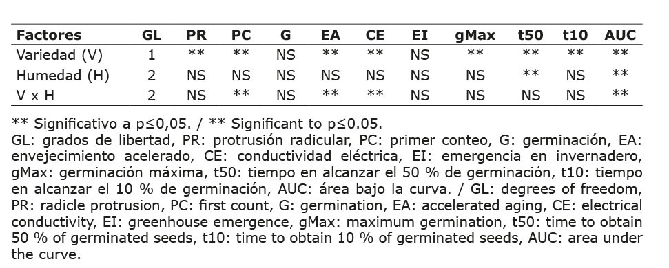 Se observó una interacción significativa entre los factores analizados (variedad y contenido de humedad de semilla), para las variables primer conteo de germinación, envejecimiento acelerado, conductividad eléctrica y AUC. En el caso de las variedades se determinó un efecto simple para las variables protrusión radicular, primer conteo de germinación, envejecimiento acelerado, conductividad eléctrica, gMax, t50, t10 y AUC; mientras que, para el factor de la humedad, se observaron diferencias en las variables t50 y AUC (Cuadro 1).