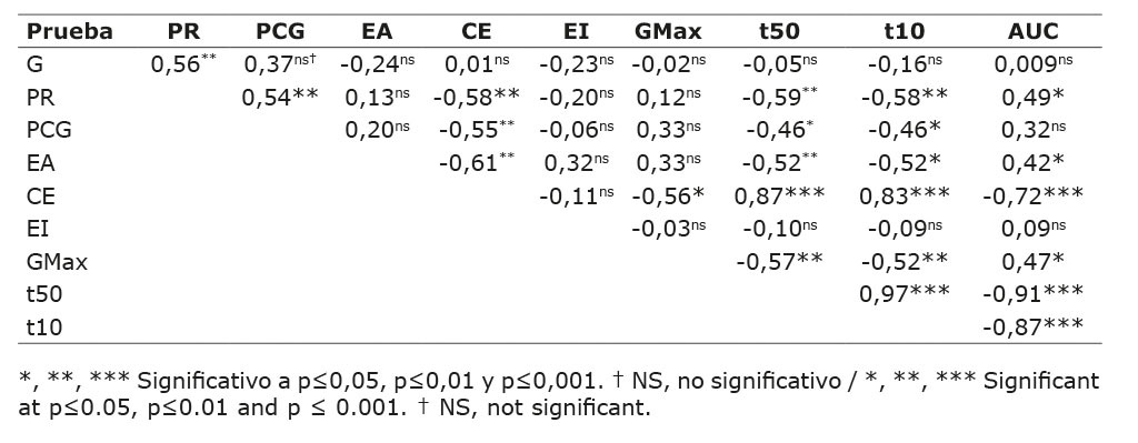 Se observaron correlaciones positivas (p≤0,001) significativas altas de la conductividad eléctrica con t50 (0,87) y t10 (0,83), y con AUC (-0,72) la correlación fue moderada negativa; mientras que, t50 presentó correlaciones muy altas con t10 (0,97) positiva y negativa con AUC (-0,91), en cuanto a la variable t10 presentó una alta correlación negativa con AUC (-0,87) (Cuadro 3).