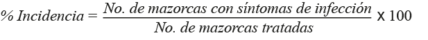 Las cinco técnicas se aplicaron con cada uno de los veinte aislamientos seleccionados. Para cada aislamiento se inocularon cincuenta plantas que se hallaban en la etapa de desarrollo reproductivo R2, denominada “blíster” (Gordon, 2021), lo que ocurrió a los 86 días después de la siembra. Se emplearon diez plantas para cada técnica de inoculación. En las parcelas testigo, conformadas por diez plantas para cada técnica, solo se usó agua estéril o palillos estériles, según correspondiera. La infestación que experimentó el testigo fue natural, por las esporas del hongo presentes en su alrededor. Después de la inoculación de las mazorcas en desarrollo con cada una de las técnicas, esta se cubrió con una bolsa de papel. La cosecha de las parcelas se realizó de forma manual en diciembre del 2019, con una humedad de grano + 25 %. La incidencia se calculó por medio del número total de mazorcas con presencia de infección y el número de mazorcas tratadas, mediante la ecuación 1.