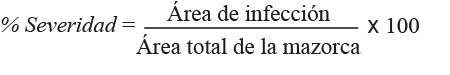 (1)Para calcular la severidad de la enfermedad, que se consideró como la relación entre el área de infección de la mazorca entre la superficie total de esta, se empleó la ecuación 2.