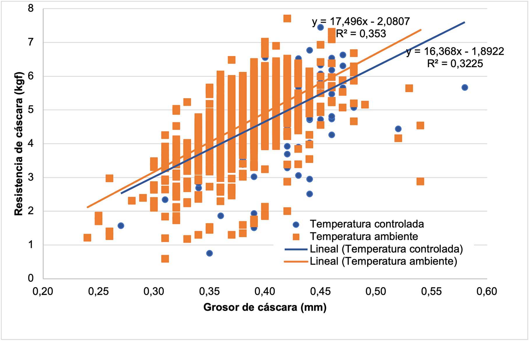 La regresión lineal entre la resistencia y el grosor de cáscara evidenció una relación positiva moderada y significativa entre la resistencia y el grosor de la cáscara (p<0,001), donde el 30 % de la resistencia se vio influenciada por el grosor de cáscara (Figura 1).