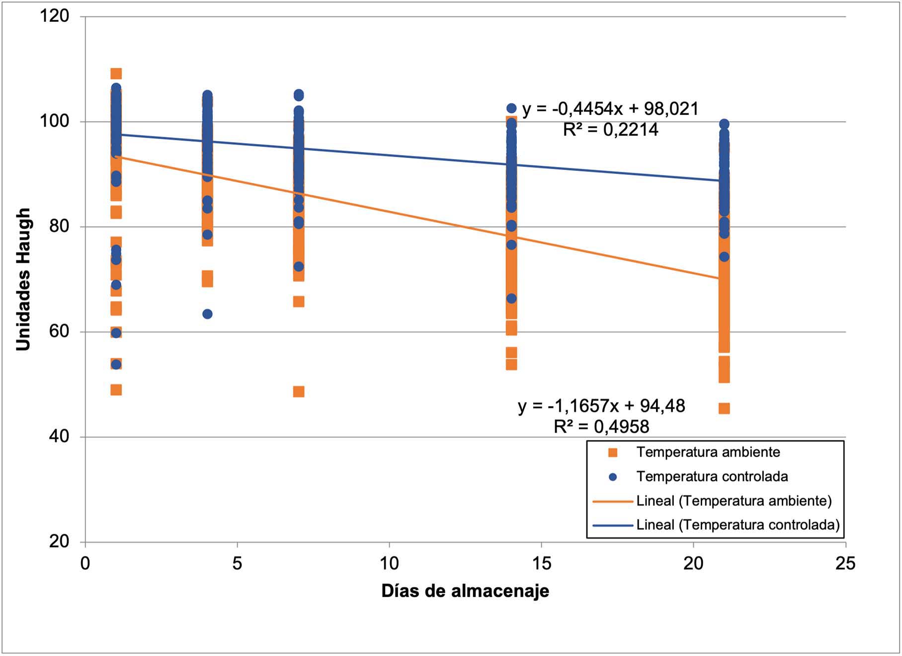 Para los resultados de unidades Haugh se realizó un análisis de regresión lineal para determinar si existió una relación con el tiempo de almacenamiento. El modelo utilizado fue el presentado en la ecuación 2.